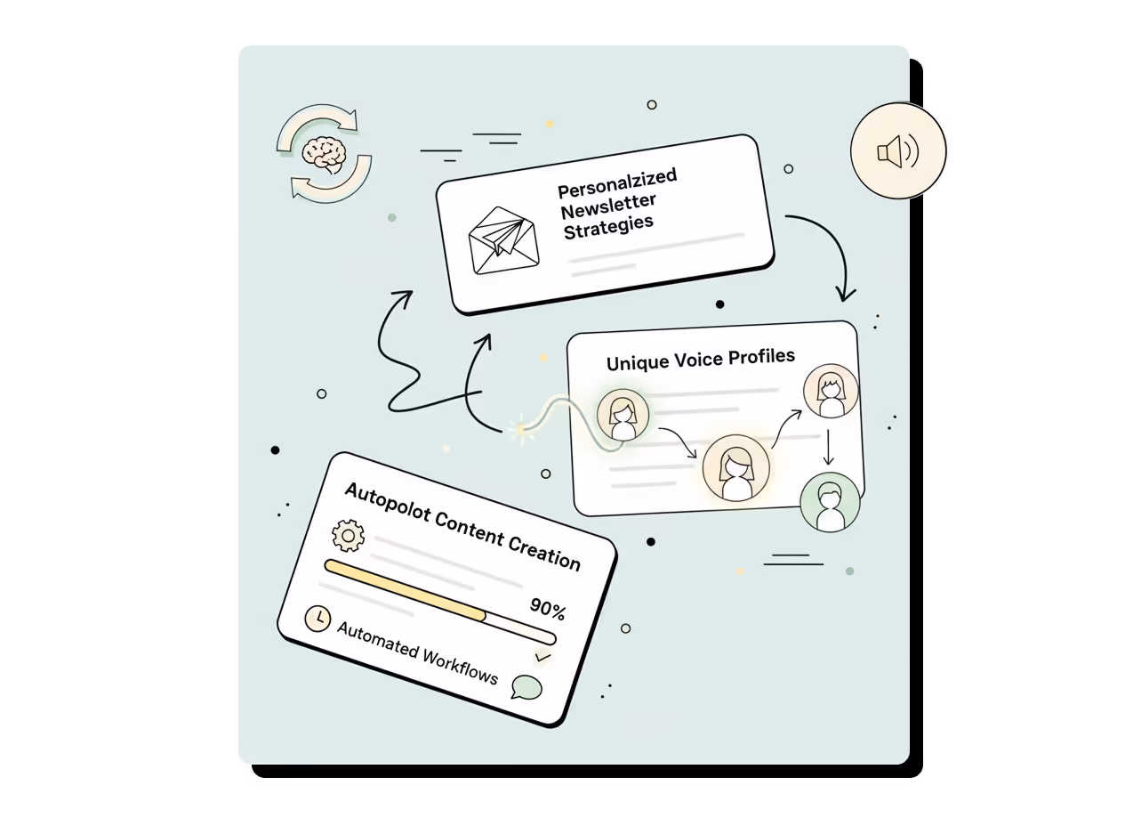 Set up unlimited brands with unique voice profiles in minutes. Captures each client's tone, personality, and backstory through intelligent onboarding. Creates custom writing frameworks that ensure every newsletter sounds authentically theirs, not AI-generated.