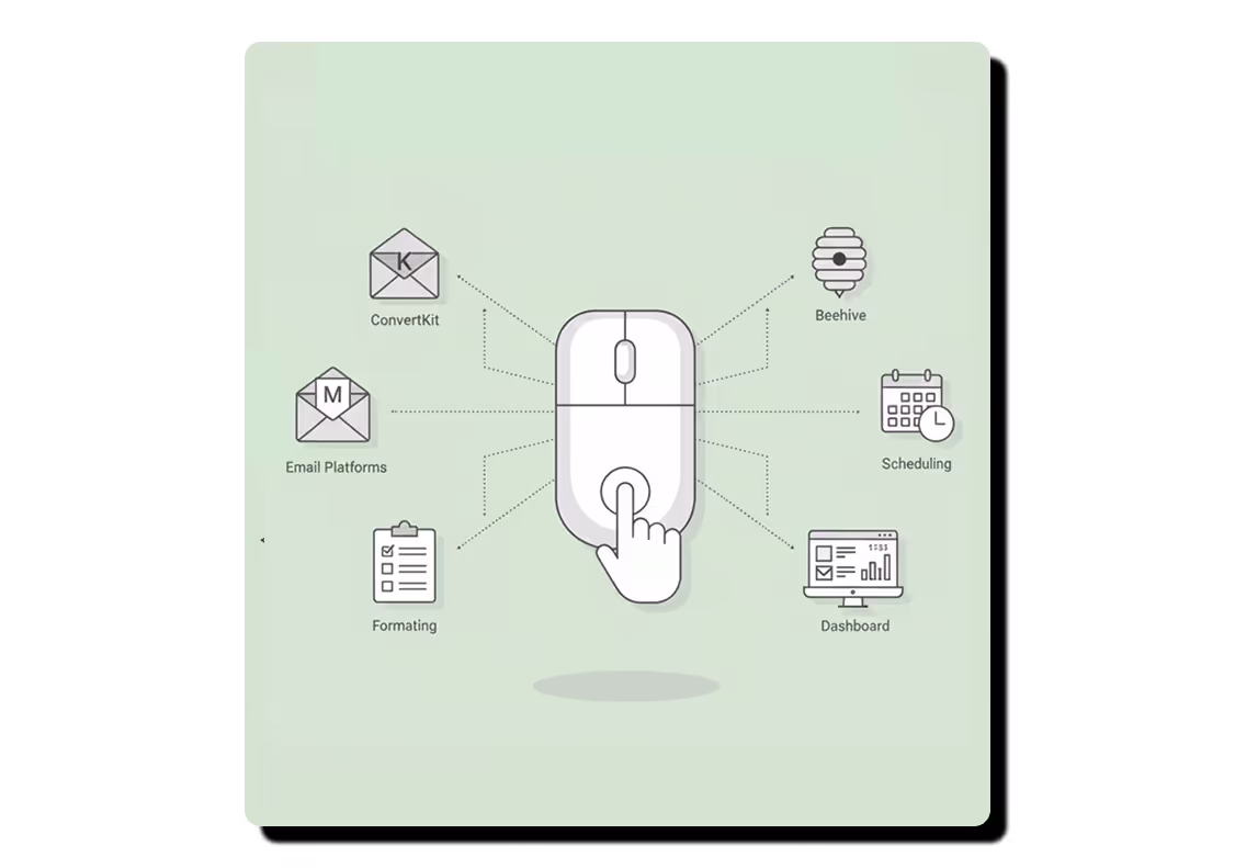 Publishes directly to ConvertKit, Beehive, Substack, and major email platforms. Handles formatting, subject lines, and scheduling automatically. Manage 100+ newsletter campaigns from a single dashboard.Retry